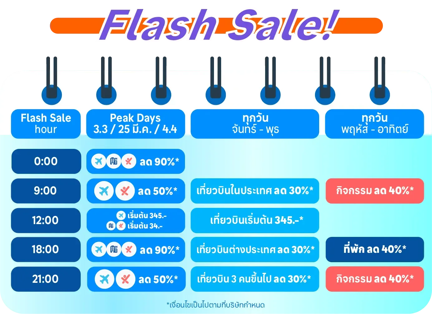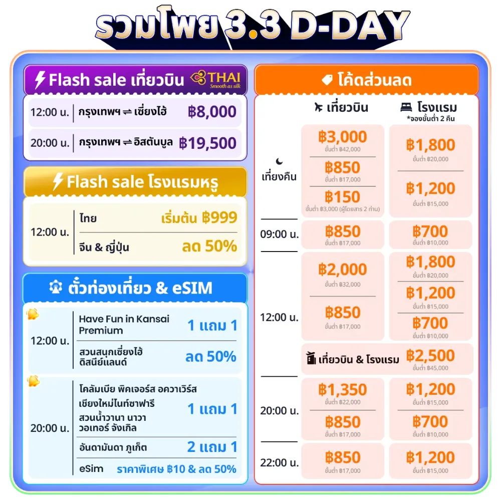 จองขั้นต่ำ 5,000 บาท ลดสูงสุด 2,500 บาท (สำหรับเที่ยวบินต่างประเทศ ใช้ได้วันที่ 3, 25 มี.ค. และ 4 เม.ย. เวลา 09.00-11.59 น., 21.00-23.59 น. เท่านั้น)