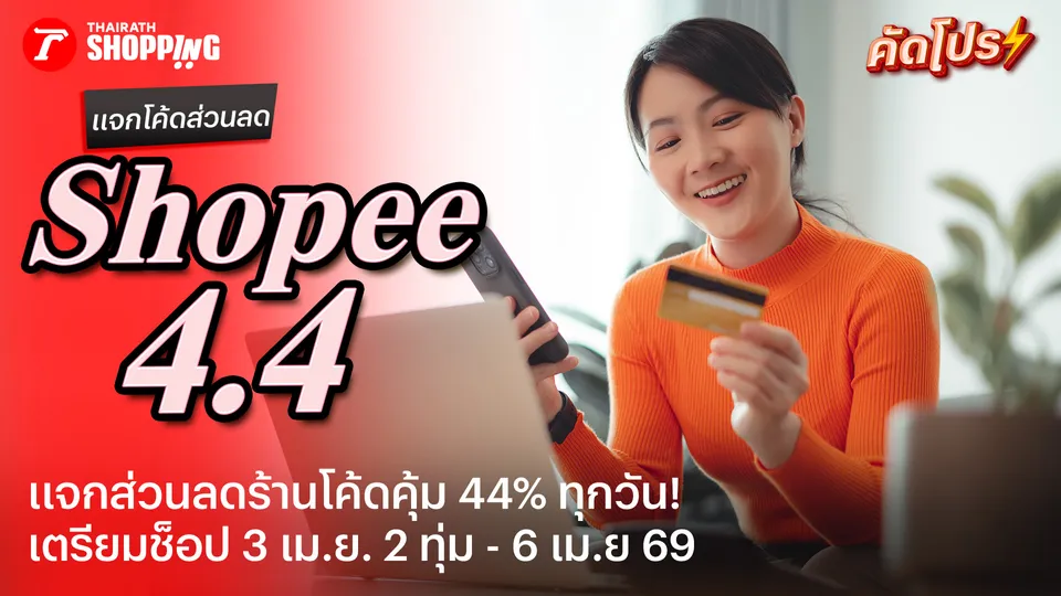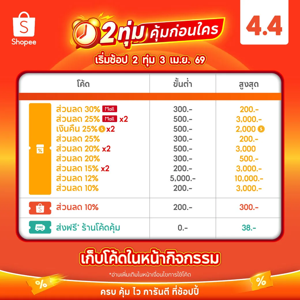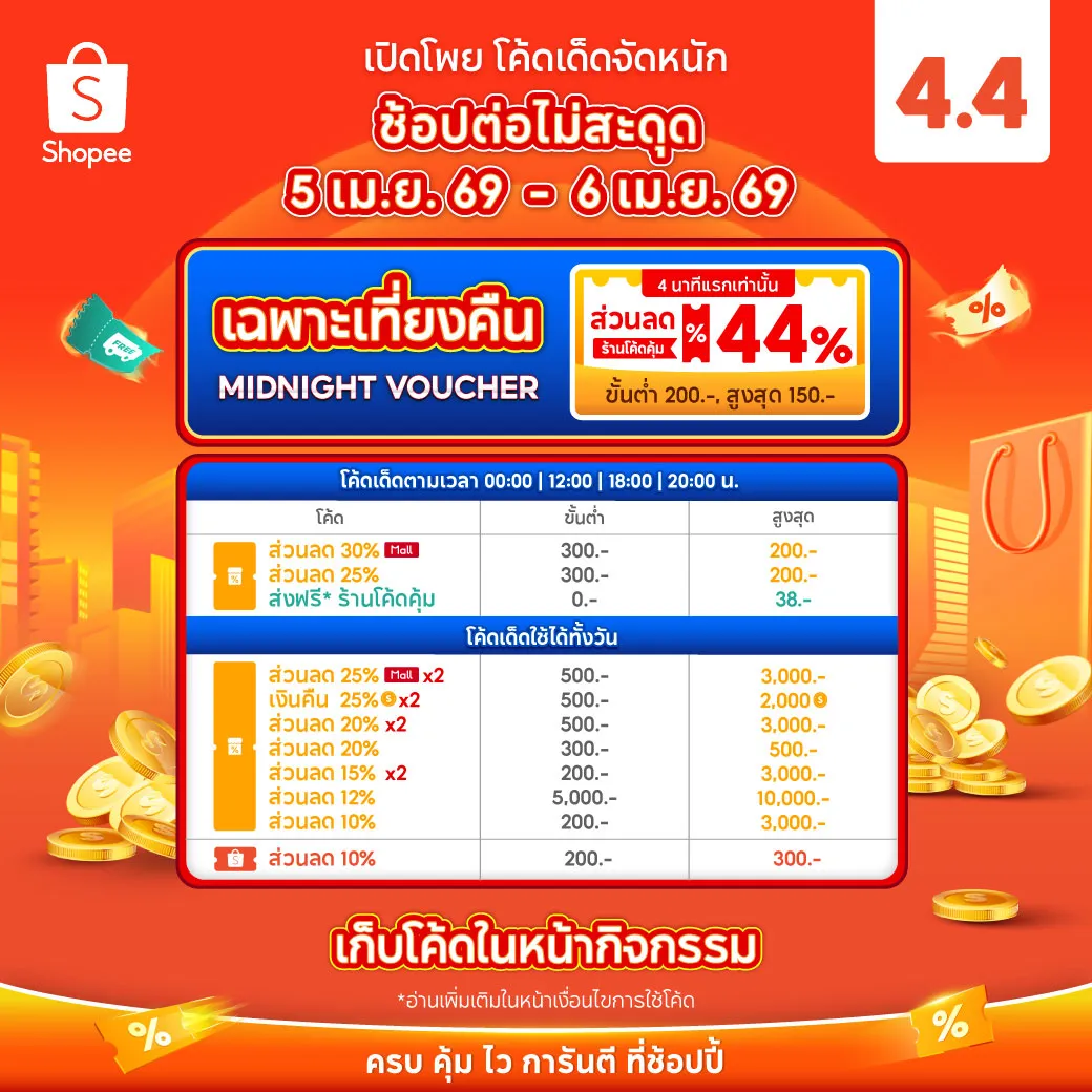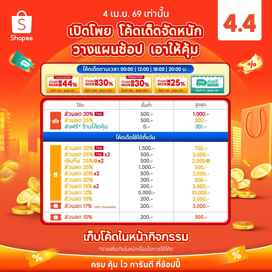 Shopee ต้อนรับซัมเมอร์และเทศกาลสงกรานต์อย่างยิ่งใหญ่ กับโปรโมชัน Shopee 4.4 ลดร้อนแรง สินค้าลดราคาเดือดๆ พร้อมโค้ดส่วนลดมากมาย แจกโค้ดส่วนลด 44% ทุกวันให้ช็อปกันแบบคุ้มๆ  และยังมีแจก 4 ล้าน Shopee Coins เวลาเที่ยงคืนเท่านั้น สำหรับ 40,000 ออเดอร์แรก* กดสินค้าลงตะกร้า เตรียมเก็บโค้ด แล้วช็อปพร้อมกันยาวๆ ตั้งแต่วันที่ 3 เม.ย. เวลา 20.00 น. ถึงวันที่ 6 เม.ย. 69 เท่านั้น