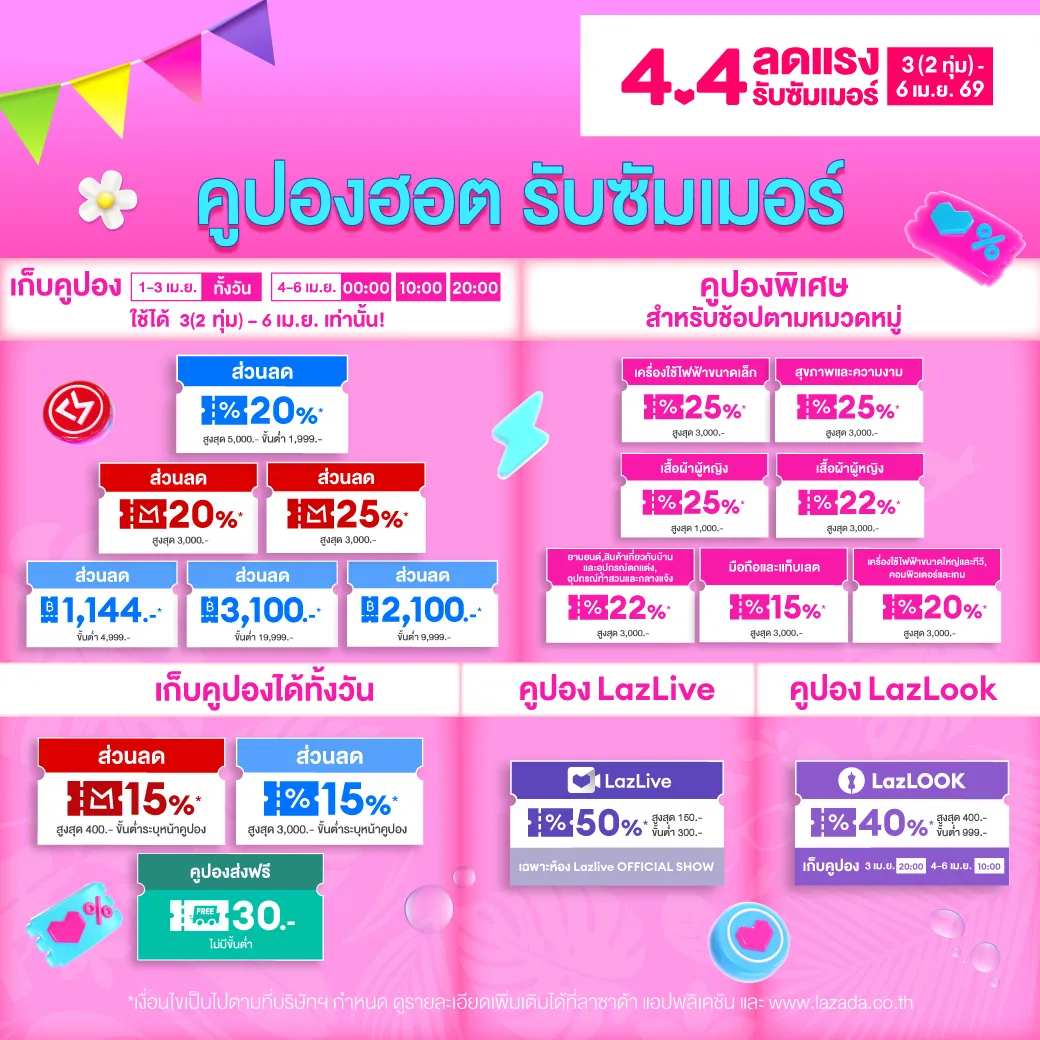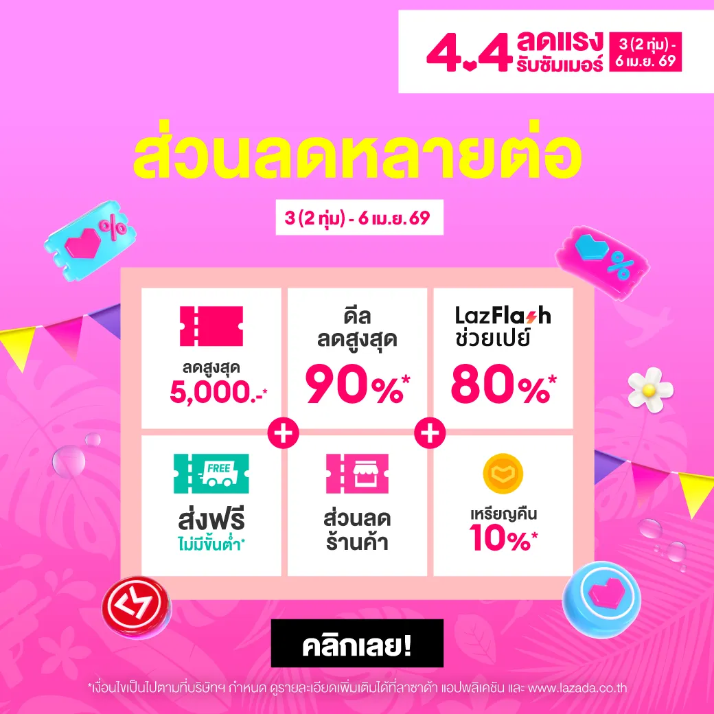 เข้าสู่หน้าร้อนอย่างเป็นทางการแบบนี้ ก่อนสาดน้ำสงกรานต์ ไทยรัฐช็อปปิ้งขอสาดโค้ดส่วนลดสุดคุ้ม จากแคมเปญ Lazada 4.4 ลดแรง รับซัมเมอร์ ให้ช็อปกันแบบฟินๆ ไม่ว่าจะเป็น คูปองส่วนลด ลดสูงสุด 5,000 บาท, คูปองส่วนลดช็อปปิ้งตามหมวดหมู่สินค้า ลดสูงสุด 3,000 บาท, คูปองส่วนลด LazMall ลดสูงสุด 3,000 บาท พร้อมคูปองส่งฟรีและสินค้าราคาพิเศษอีกมากมาย ลาซาด้า 4.4 เริ่มต้นตั้งแต่วันที่ 3 (2 ทุ่ม) - 6 เมษายน 2569