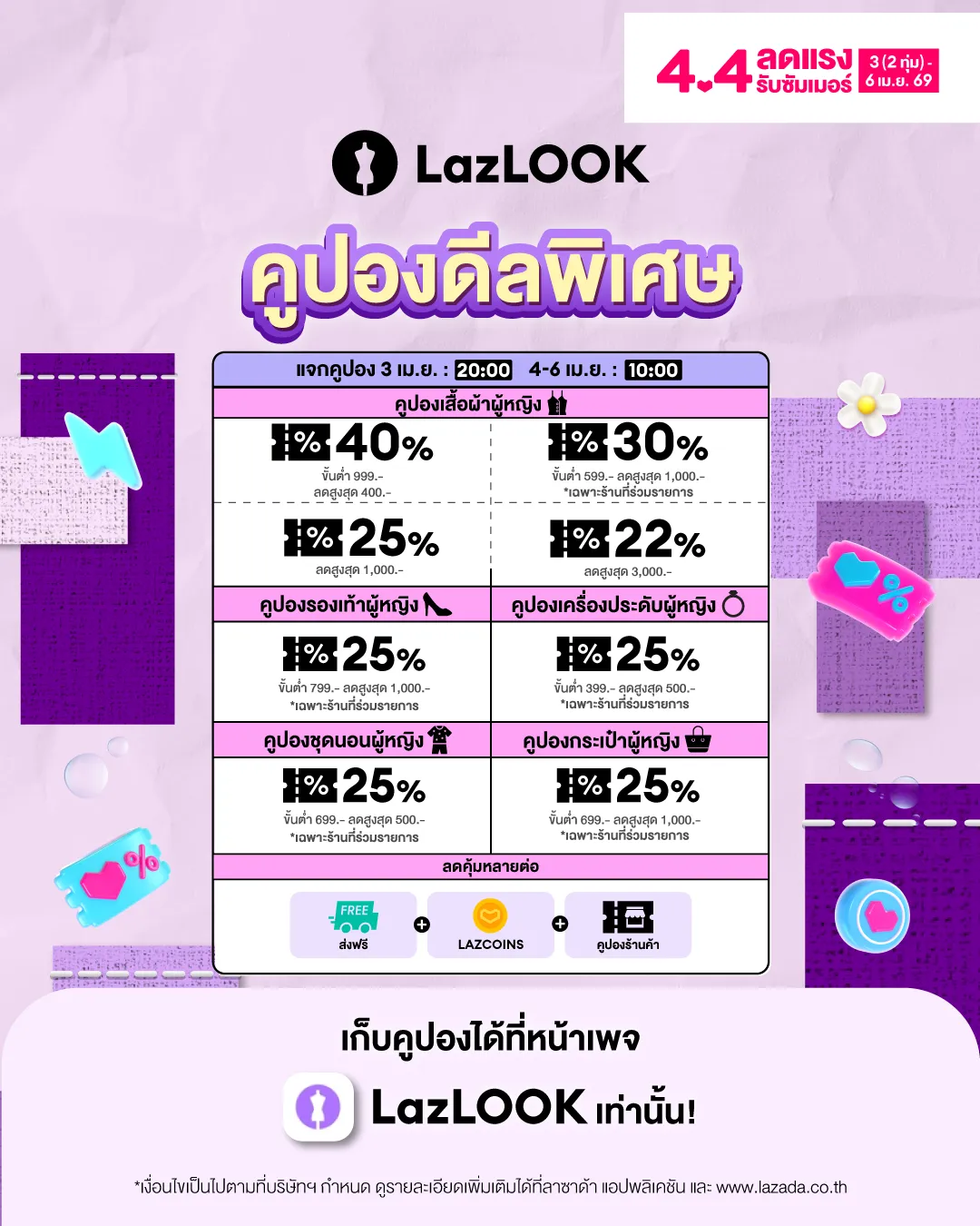 LazLook 4.4 คูปองดีลพิเศษ สำหรับสาวๆ สายแฟ หรือหนุ่มๆ ที่กำลังมองหาสินค้าแฟชั่นสุดเก๋ไว้เซอร์ไพรส์แฟน แจกคูปองตั้งแต่วันที่ 3 เม.ย. เวลา 20.00 น. และ 4-6 เม.ย. เวลา 10.00 น.
