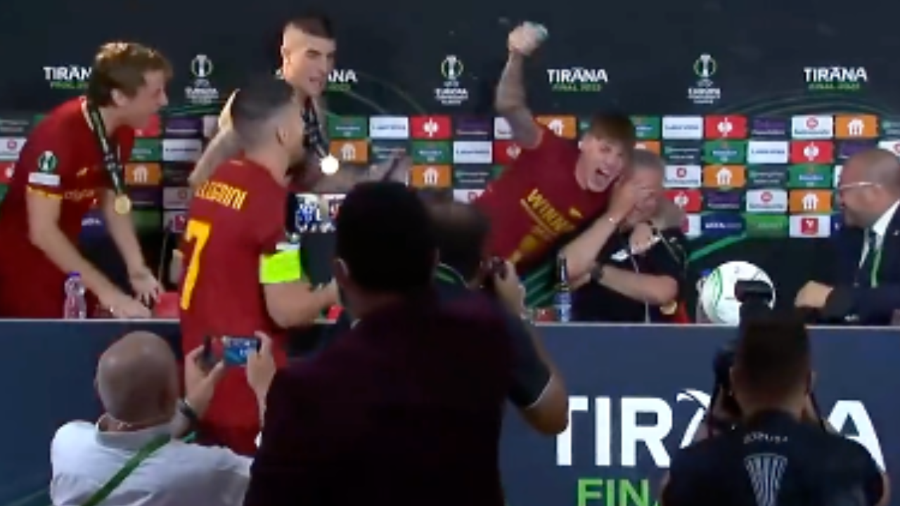 แข้ง “โรมา” บุกห้องแถลงข่าว ชวน “มูรินโญ” ร่วมฉลองแชมป์แบบสุดเหวี่ยง (คลิป)