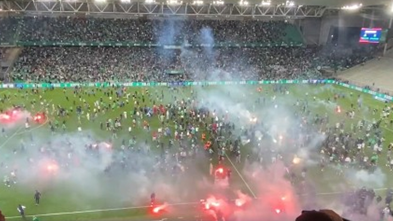 รับไม่ได้ แฟนทีมดังฝรั่งเศสบุกลงสนามยิงพลุไม่พอใจ หลังทีมตกชั้นสู่ลีกรอง (คลิป)