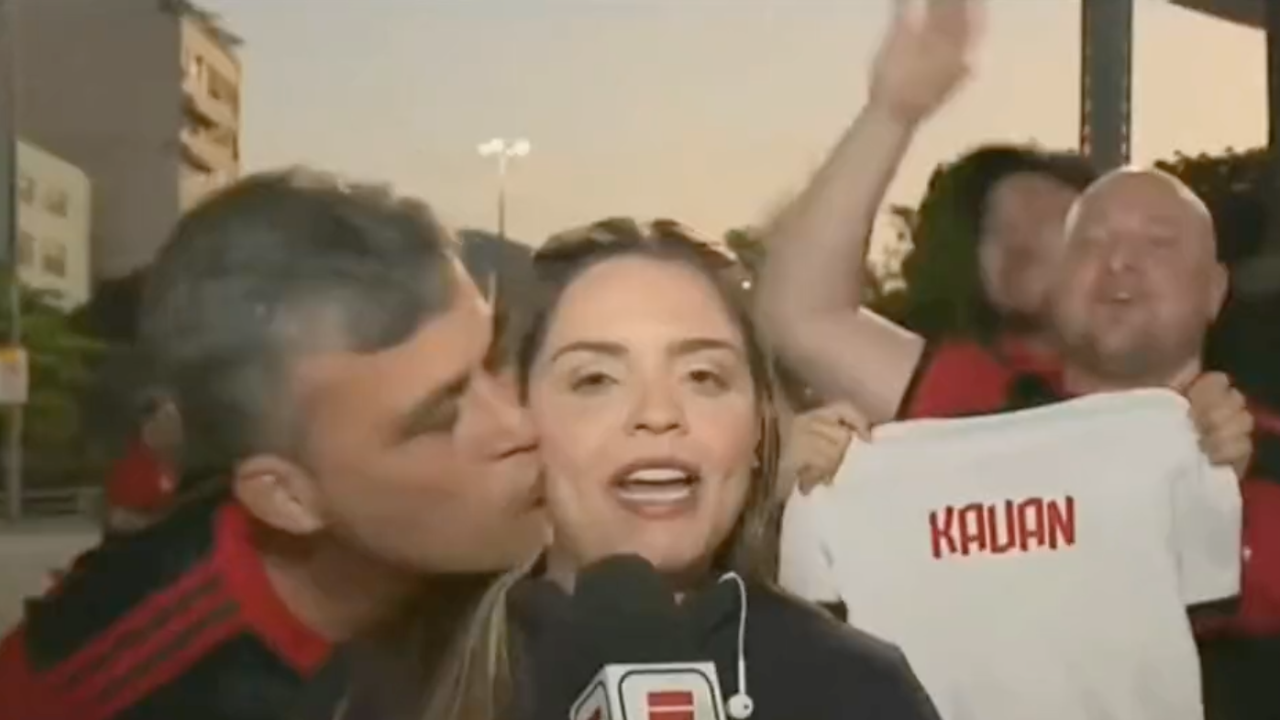 ทำไปได้ แฟนบอลบราซิล โดนเชิ้ตดำรวบหลังจุ๊บแก้มนักข่าวสาวออกทีวี (คลิป)