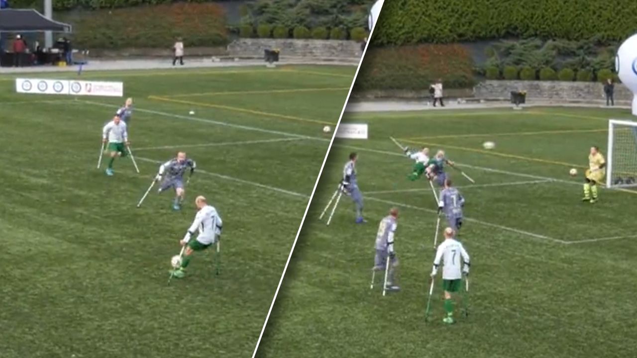 ระดับโลกยังต้องอาย แข้งขาเดียวสุดโหด กระโดดตีลังกาฟาดบอลเข้าประตู (คลิป)