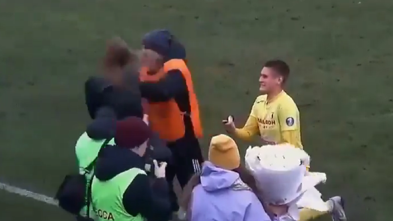 งงทั้งทีม นักบอลคุกเข่าขอแต่งงาน แต่โดนการ์ดสนามผลักว่าที่เจ้าสาวกระเด็น (คลิป)