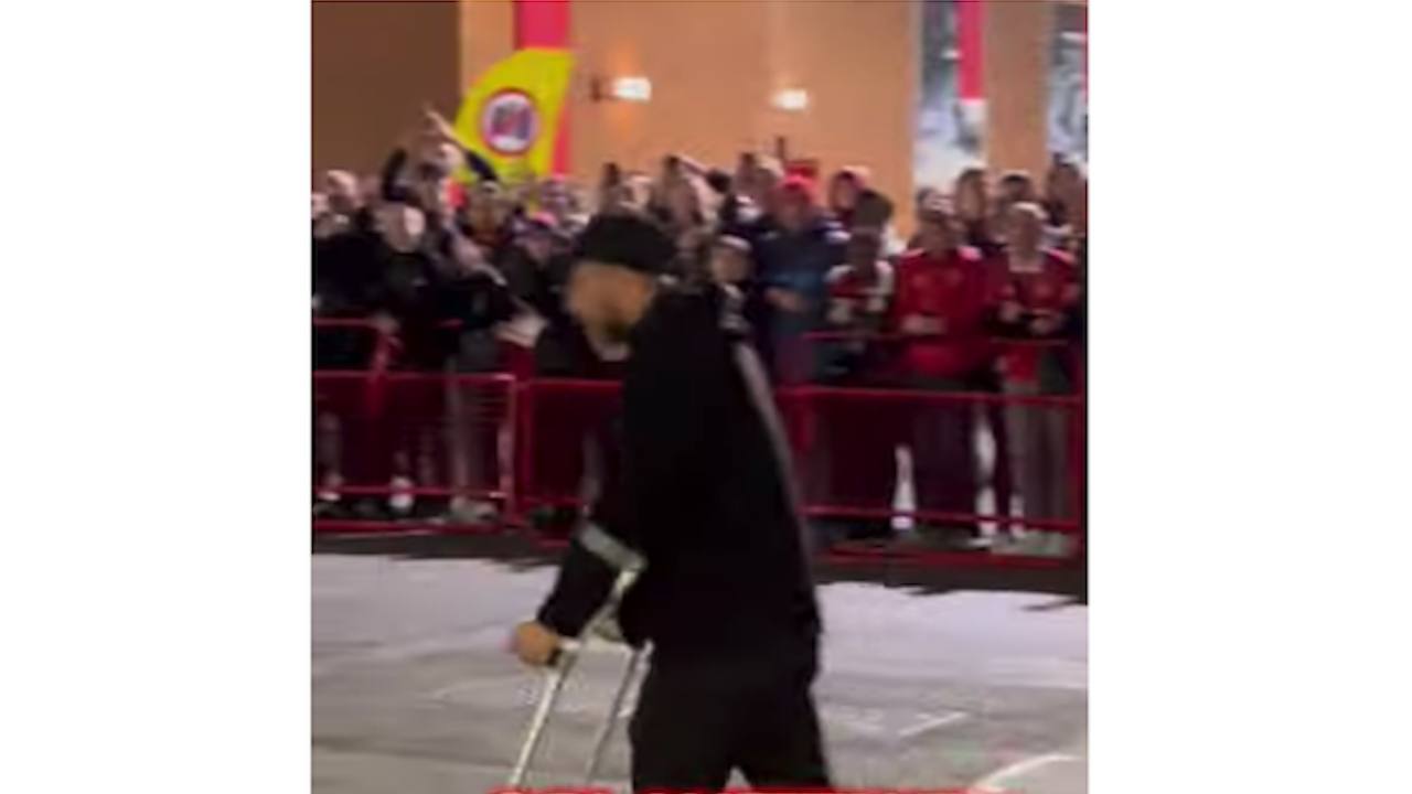 ได้ใจแฟนผี ชมคลิป “อีริคเซน” ใส่เฝือก-ใช้ไม้ค้ำยัน มาเชียร์ แมนยูฯ โค่น บาร์เซโลนา