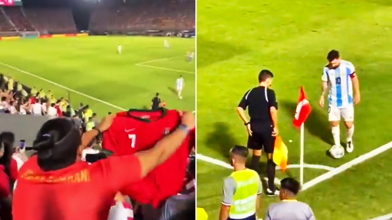 อย่างแสบ แฟนบอล "ปารากวัย" ชูเสื้อโปรตุเกส สกรีนชื่อ "โรนัลโด" ใส่ "เมสซี" ที่กำลังเตะมุม (คลิป)