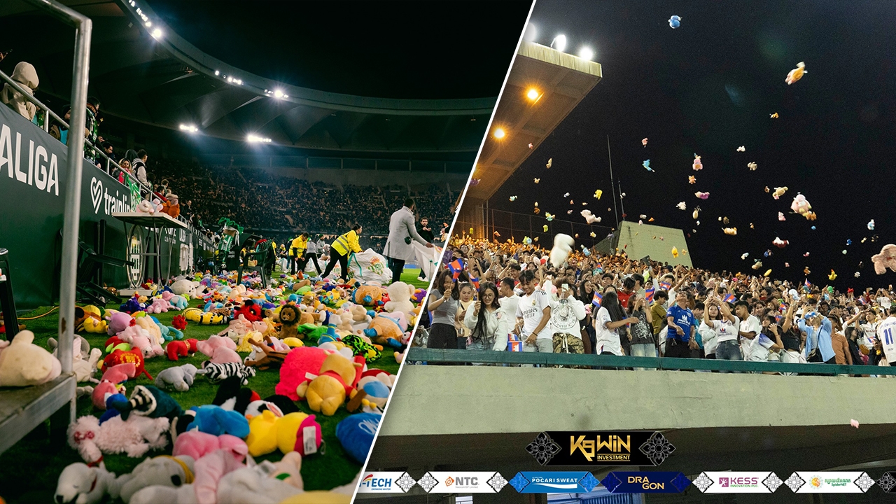 ทีมลีกกัมพูชา ขว้างตุ๊กตาลงสนาม ส่งต่อให้เด็กกัมพูชา หนีจากเหตุปะทะ ไทย-กัมพูชา (คลิป)