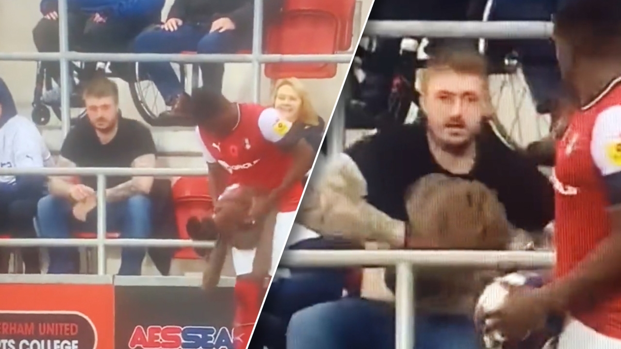 รักทั้งใจอะไรก็ยอม แฟนบอลหนวดเฟิ้มถอดเสื้อให้นักเตะใช้เช็ดลูกบอลก่อนทุ่ม (คลิป)