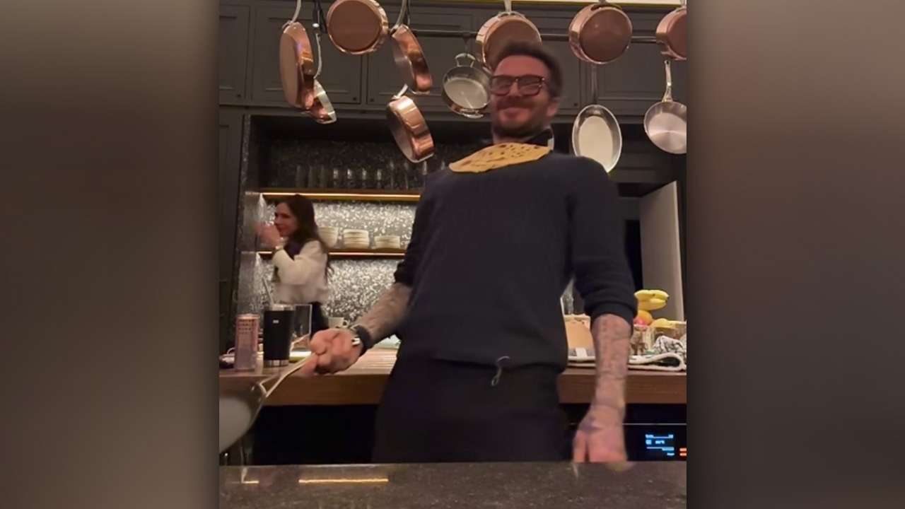 หล่อก็ตลกเป็นนะ "เบคแคม" ฉลอง "วันแพนเค้ก" โชว์ลีลาสุดฮา ทำ "วิคตอเรีย" ขำเบาๆ (คลิป)