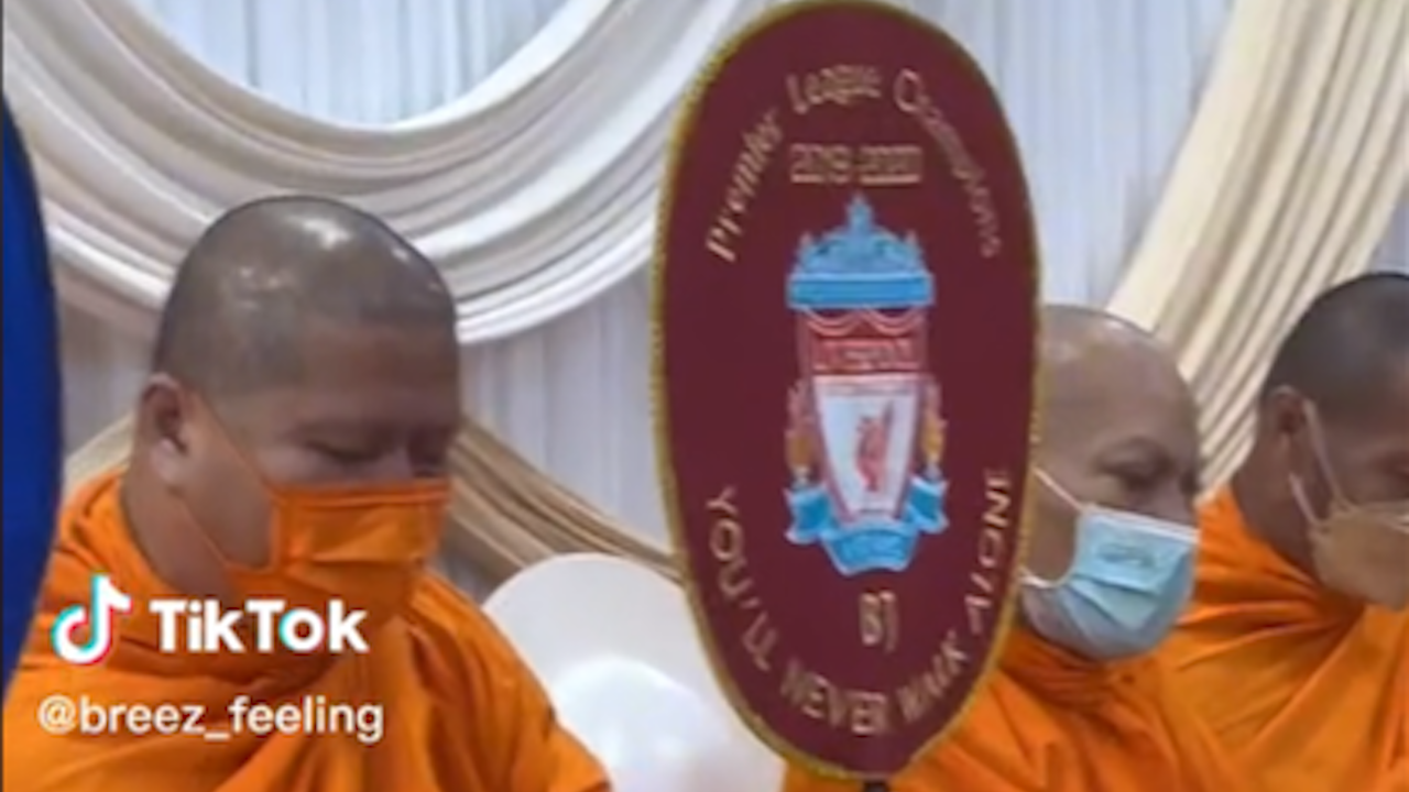 โซเชียลฮือฮา "หลวงพี่" ใช้ตาลปัตร "ตราสโมสรลิเวอร์พูล" ระหว่างพิธีสงฆ์ในงานแต่ง (คลิป)