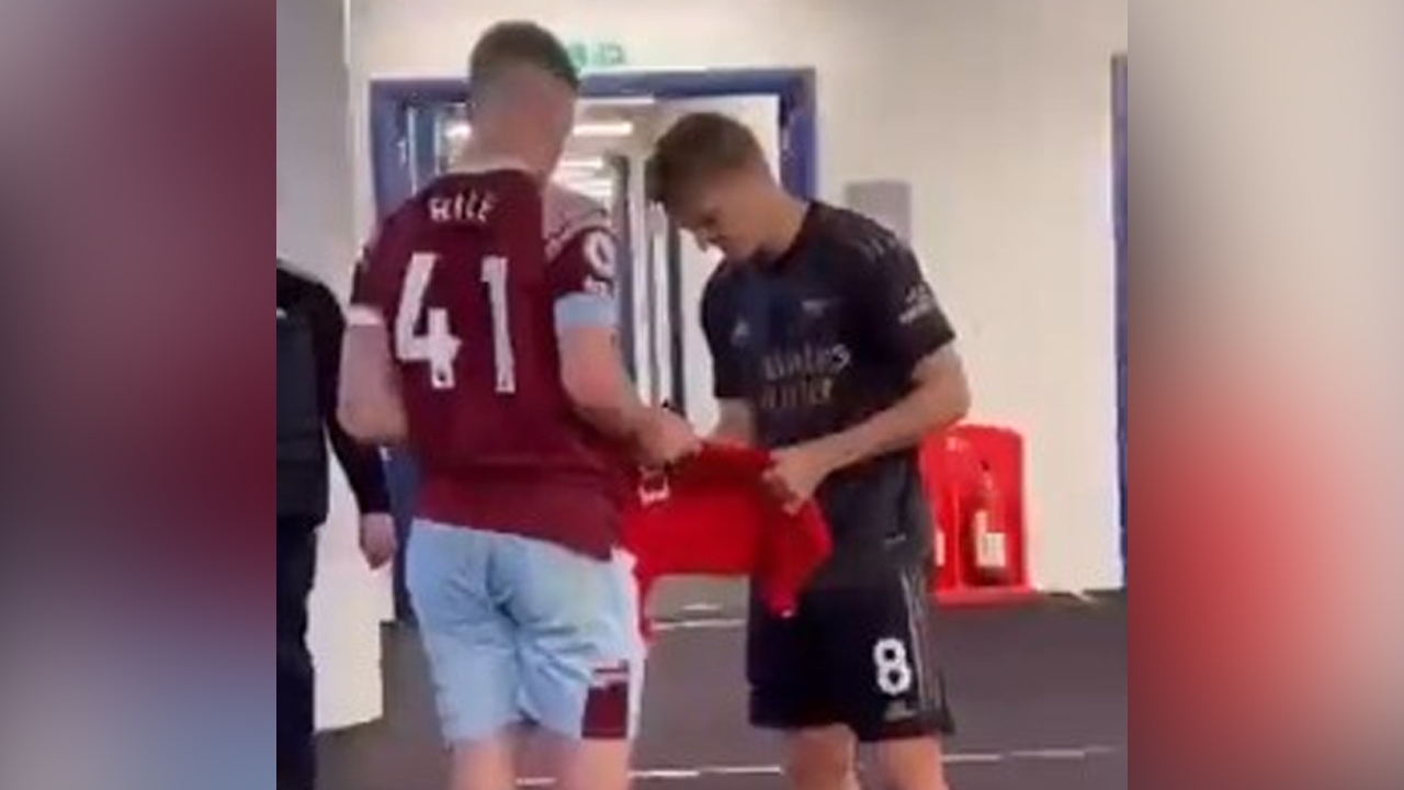 “ไรซ์” ถือเสื้อ “อาร์เซนอล” ขอลายเซ็น “โอเดการ์ด” แบบไม่แคร์ข่าวลือย้ายทีม (คลิป)