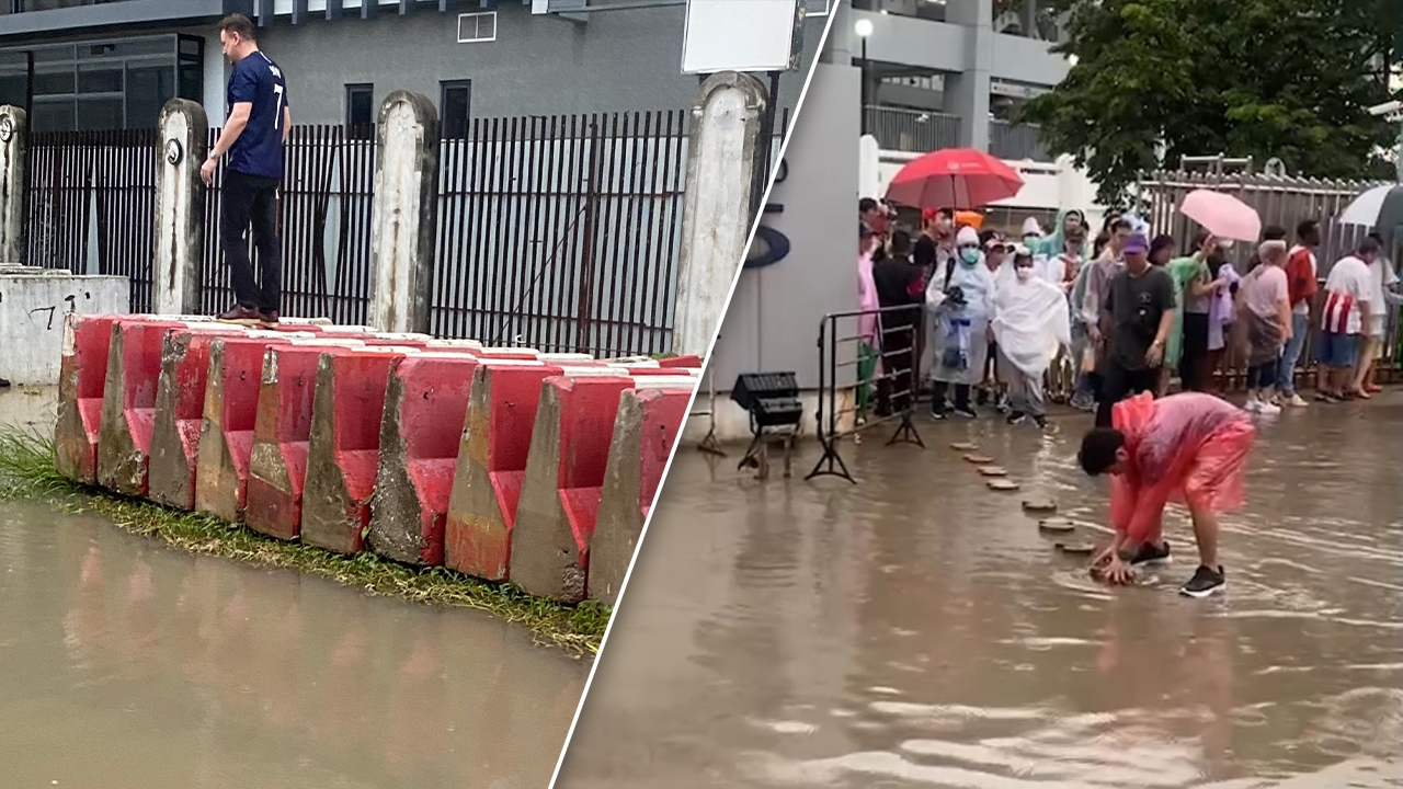 น่าอนาถ "แฟนบอลต่างชาติ" ปีนแบริเออร์หนีน้ำ ยกเลิกเกม เลสเตอร์ vs สเปอร์ส (คลิป)