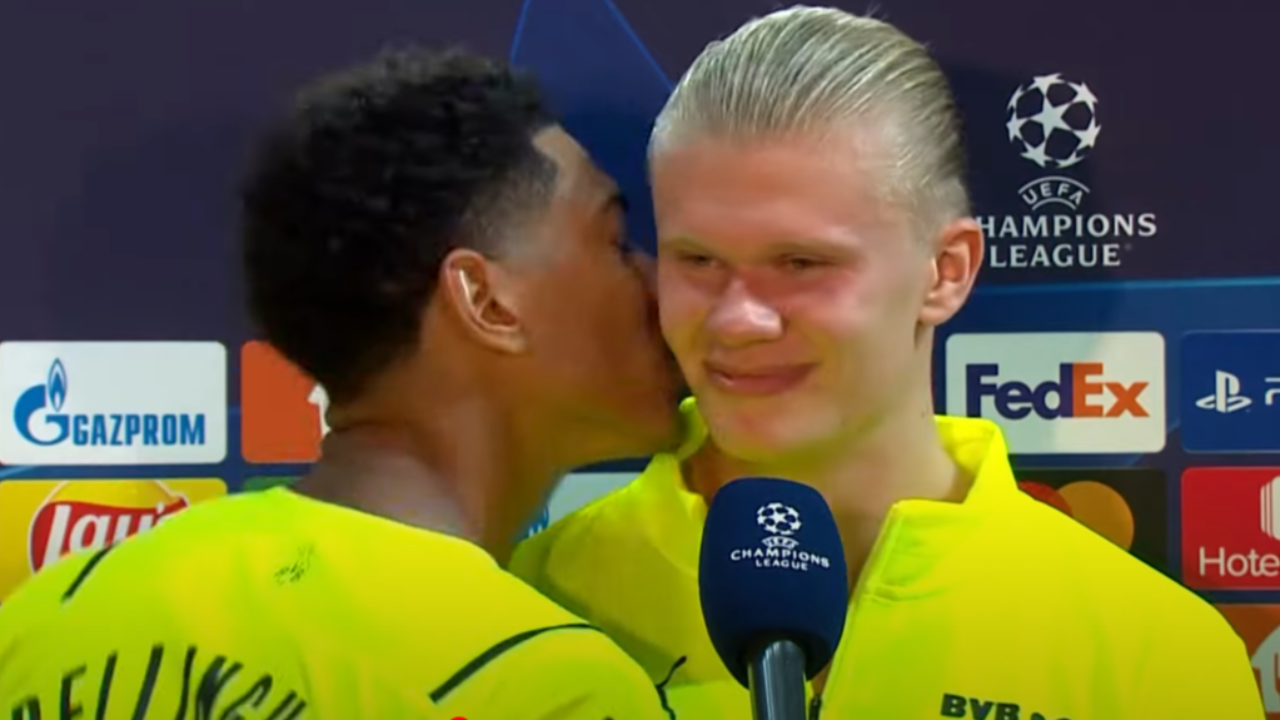 "ฮาแลนด์" หน้าแดง โดนเพื่อนร่วมทีมขโมยจูบระหว่างให้สัมภาษณ์ (คลิป)