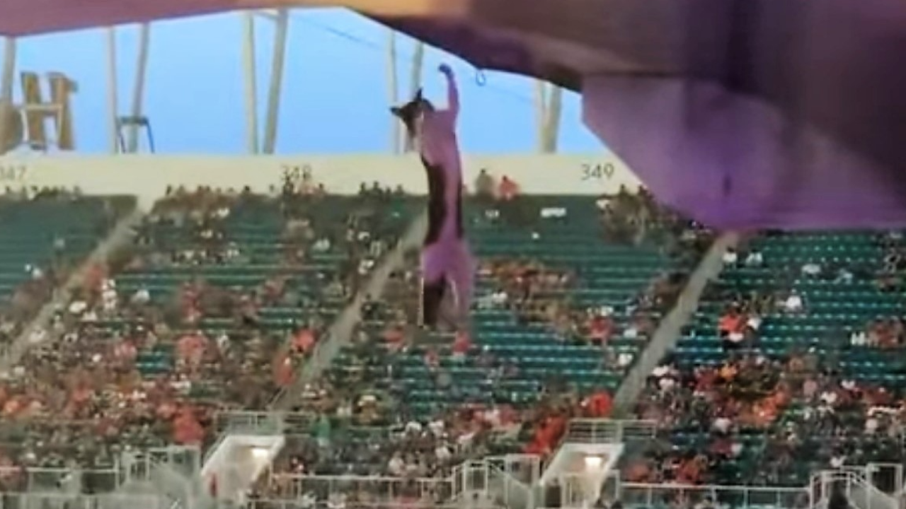 รอดหรือไม่ คนทั้งสนามพร้อมใจช่วยลูกแมวโหนเชือกเล่นก่อนร่วงลงพื้นหวิดดับ (คลิป)