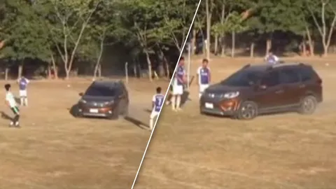 เกิดอะไรขึ้น! "รถยนต์" วิ่งเข้ากลางสนามฟุตบอล เกือบชน "นักเตะ" (คลิป)