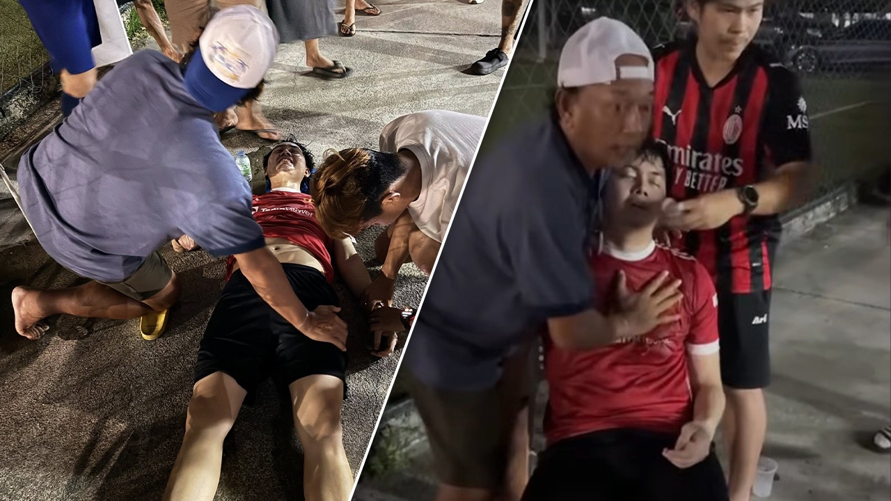 ชมวินาทีชีวิต "ชายหนุ่ม" ช่วยปั๊มหัวใจ "นักฟุตบอลไทย" หลังหายใจไม่ทันในสนาม (คลิป)