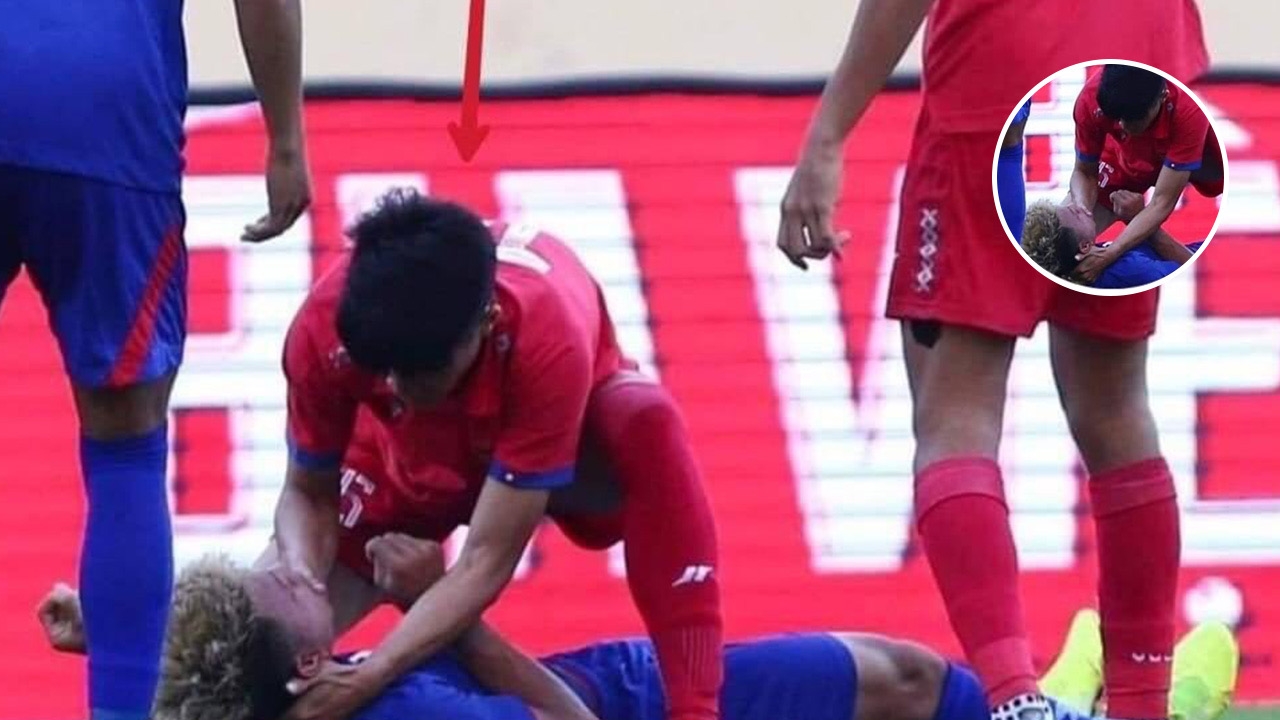 มิตรภาพ แข้งสปป.ลาว ให้ผู้เล่นกัมพูชากัดมือ หลังเกิดอาการชัก กันกัดลิ้นตัวเอง