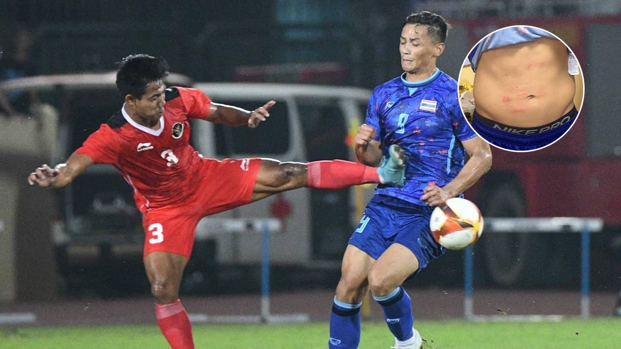 โหดเกิน "กุสตาฟส์สัน" กองหน้าไทย โพสต์ร่องรอยโดน แข้งอินโดฯ ถีบท้อง