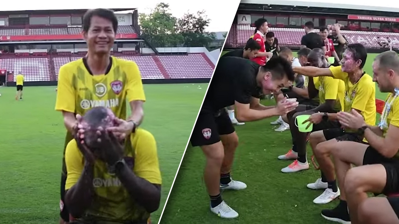 ชุ่มฉ่ำ นักเตะ "เมืองทอง" รดน้ำดำหัวสตาฟฟ์โค้ช เนื่องในวันสงกรานต์ (คลิป)