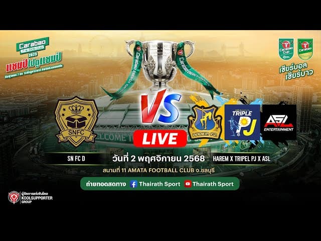 สนามนี้ใครจะได้เป็นแชมป์ กับการแข่งขันฟุตบอล ทัวร์นาเมนต์สุดยิ่งใหญ่ประจำปี Carabao 7-a-Side Cup 2025 ️ สนามที่ 11 AMATA FOOTBALL CLUB จ.ชลบุรี คู่ชิงชนะเลิศ เป็นการพบกันระหว่าง SN FC D VS HAREM x TRIPEL PJ x ASL ติดตามรายละเอียดการแข่งขันที่เพจ https://www.facebook.com/CarabaoSportTH ดูกฎกติกาการแข่งขันได้ที่ https://www.carabao.co.th/7-a-Side-Cup/ #Carabao7asidecup2025 #ฟุตบอล7คน #CarabaoTawandangBeverage #Carabao #CarabaoCup2025 #คาราบาวคัพ2025 #เชียร์บอลเชียร์บาว #แชมป์ไปดูแชมป์ #ไทยรัฐข่าวCarabao7aSideCup2025 ----------------------------------------------------- กด Subscribe ติดตาม & กดกระดิ่งได้ที่ : https://www.youtube.com/@ThairathSport/?sub_confirmation=1 . ไทยรัฐ สำนักข่าวอันดับ 1 ของไทย #Thairathsports #ไทยรัฐสปอร์ต #เพื่อนกีฬามหาชน #ไทยรัฐ #ไทยรัฐทีวี #Thairath #THAIRATHTV . ติดต่อโฆษณา โทร. 02-126-1644 โทร. 02-127-1111 ต่อ 2144