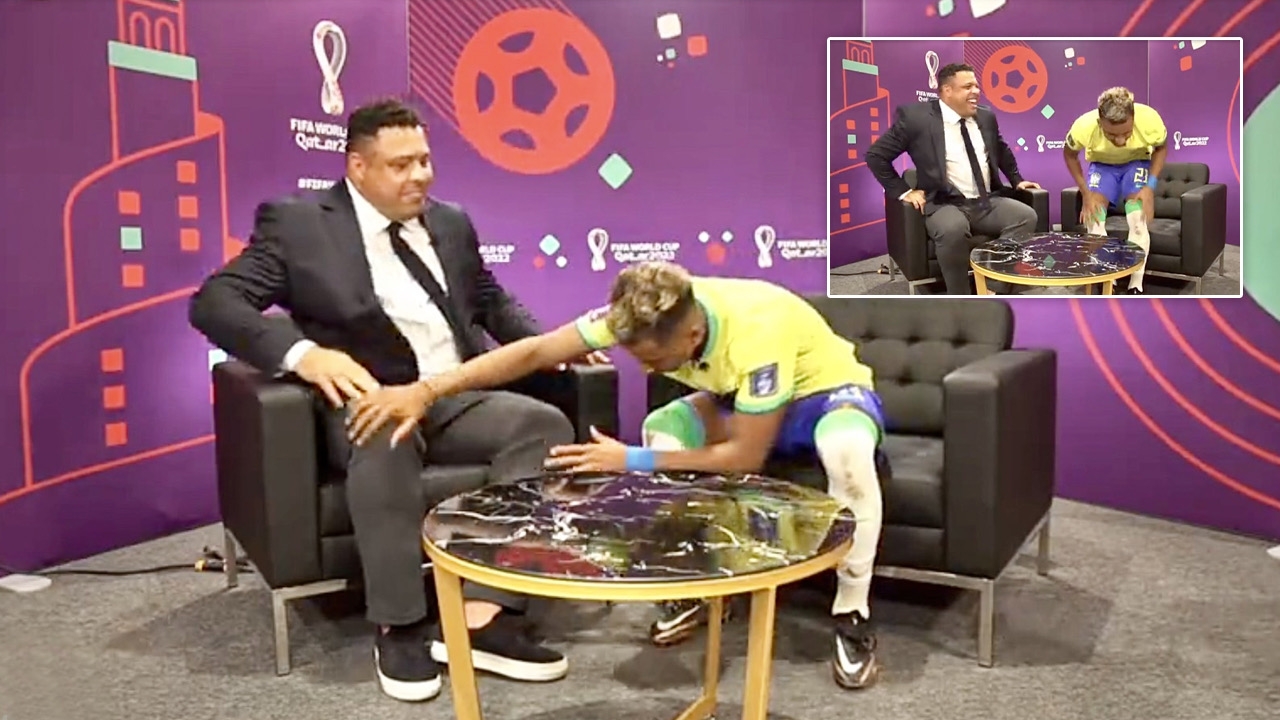 เพื่อความเป็นสิริมงคล "โรดริโก" ลูบขา "โรนัลโด" หลังให้สัมภาษณ์เสร็จ (คลิป)