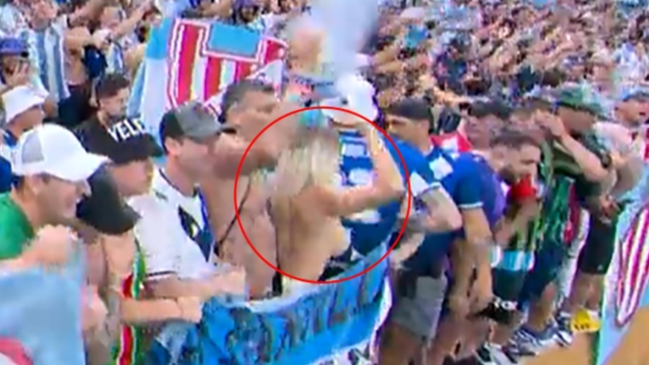 อย่าหาทำ แฟนบอลโดนหิ้วออกจากสนามรอบชิง "ฟุตบอลโลก 2022" หลังโชว์หน้าอกออกทีวี (คลิป)