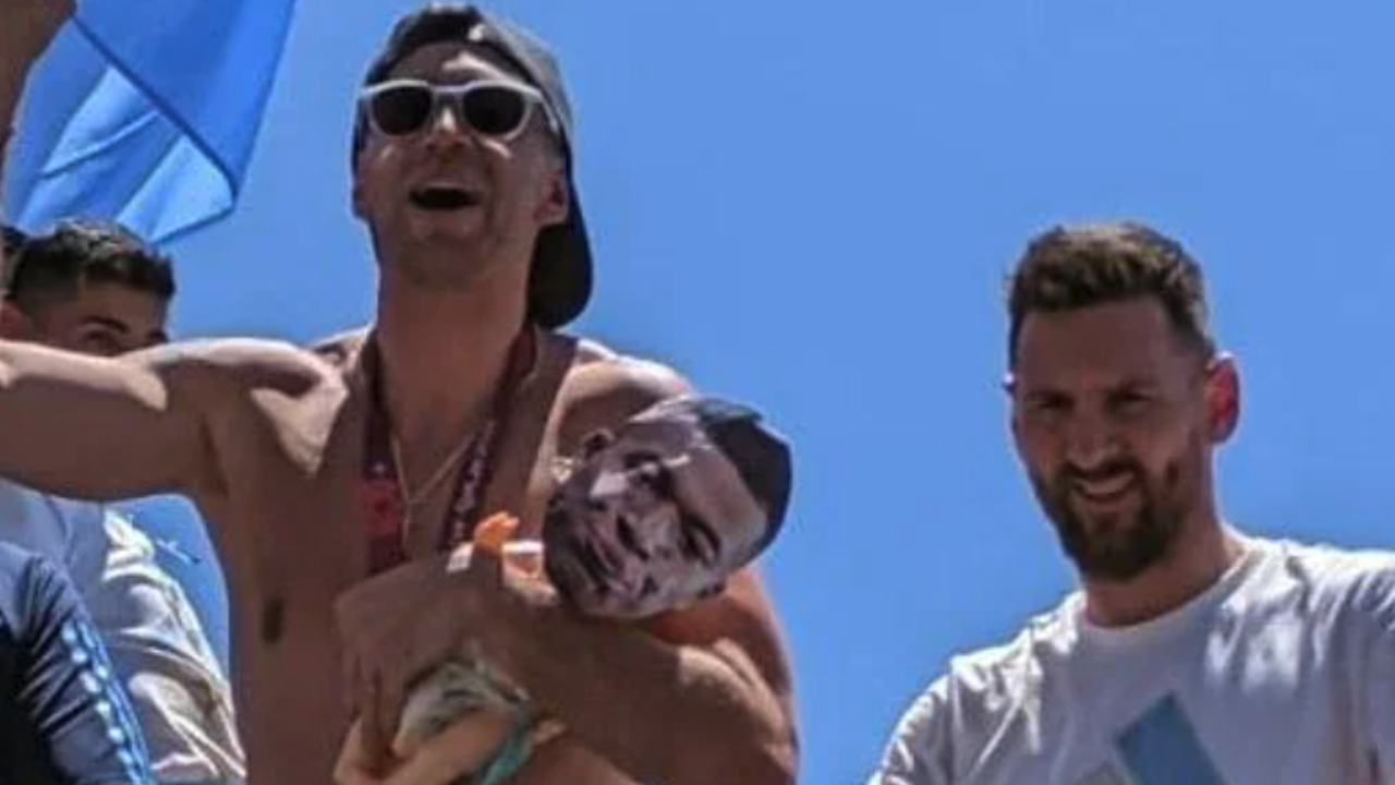 โดนไป 4 ลูกยังกล้า "โกลอาร์เจนตินา" อุ้มตุ๊กตารูปเอ็มบัปเป ระหว่างแห่แชมป์บอลโลก 2022