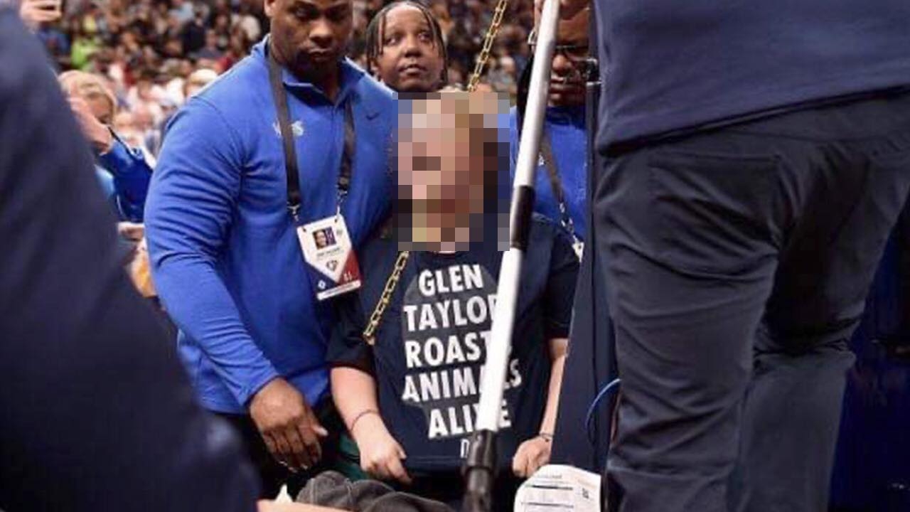 นักสิทธิสัตว์ ผูกคอกับแป้นบาส ประท้วงเจ้าของทีม “ทิมเบอร์วูล์ฟส์” (คลิป)
