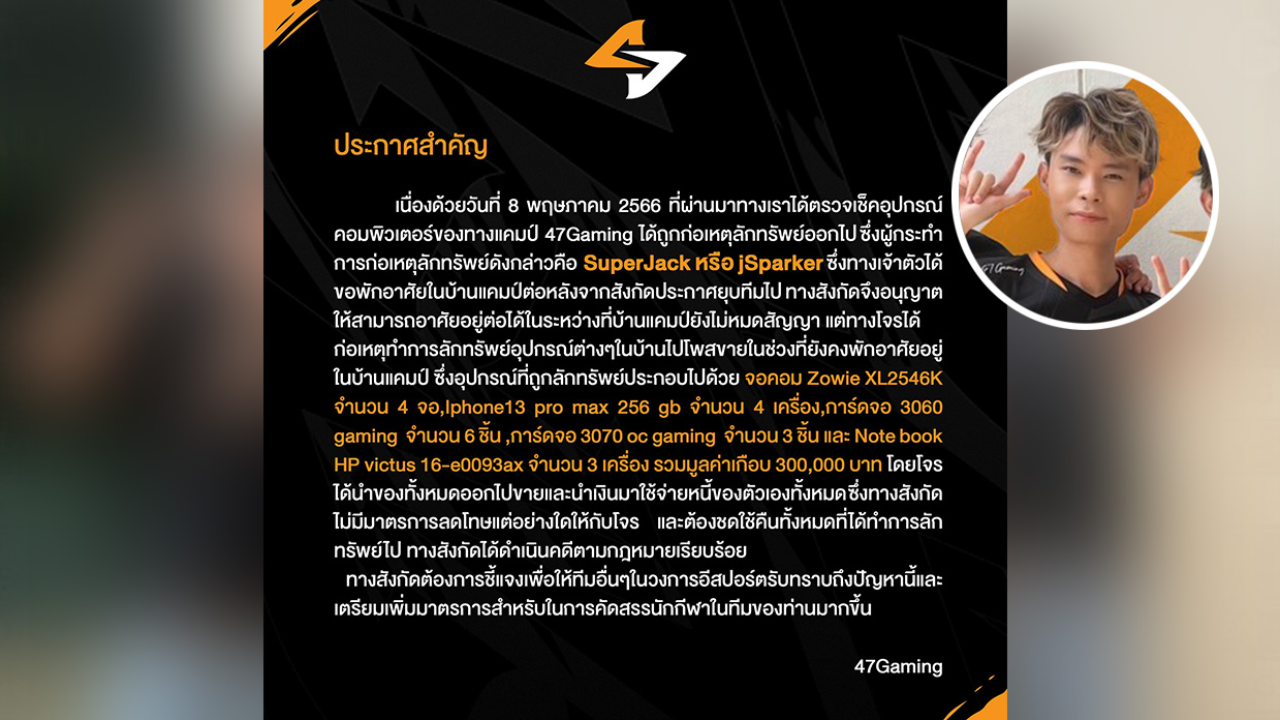 ทีมดัง E-sport ไทยแฉแหลก อดีตนักกีฬาในสังกัด ขโมยของในบ้านแคมป์ เอาไปขายใช้หนี้
