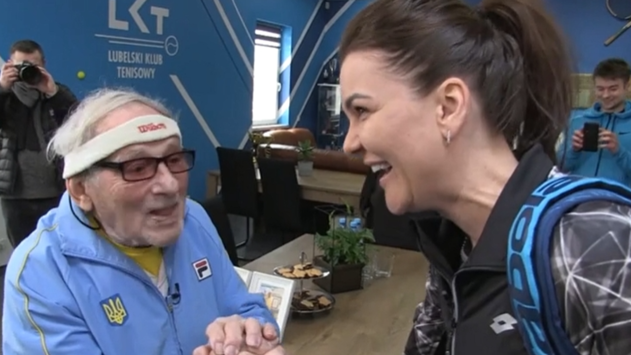 98 แล้วไง "นักเทนนิสอายุมากสุดในโลก" ดวลแร็กเกตกับ "รัดวานสกา" (คลิป)
