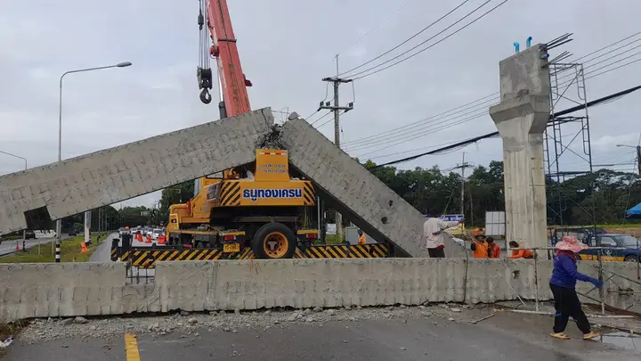 นาทีคานสะพานลอยหนักกว่า 116 ตัน พังถล่มขวางถนน ที่ จ.จันทบุรี