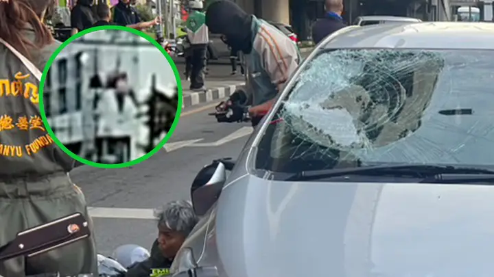 ไรเดอร์หลับใน ทำลูกค้าสาวตกสะพานข้ามแยก ตกใส่กระจกรถเก๋ง