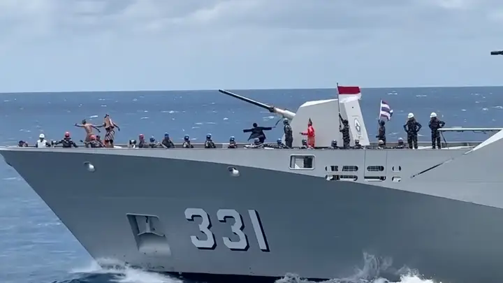 อินโดนีเซียเต้นท่าสุดฮิตบนเรือรบ โบกธง 2 ชาติ แสดงถึงมิตรภาพอันดี